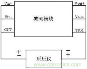 作為模塊電源的重要指標,標準中也規(guī)定了隔離耐壓相關測試方法,簡單的測試時一般采用等電位連接測試,連接示意圖如下: