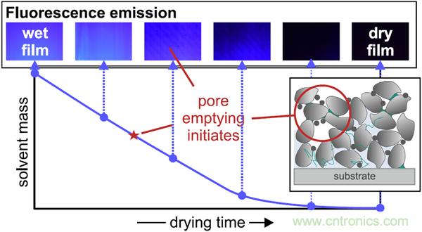 德國卡爾斯魯厄理工學(xué)院薄膜技術(shù)研究所的Stefan Jaiser等人引入了一種實驗裝置,在涂層干燥溶劑蒸發(fā)過程中能夠測量涂層的收縮,涂層表面液體含量,以及表面孔洞消失的過程。在電極漿料中少量加入一種熒光增白劑,涂層中的液體在UV-A紫外線輻照下能夠發(fā)出藍光,因而可以用相機觀察到液相。圖像處理可以估算涂層表面的液體含量,跟蹤電極孔隙中的液相消失過程。同時,濕涂層的厚度采用二維激光位移傳感器測量。實驗結(jié)果揭示了液相去除,電極孔隙中開始形成的時刻。