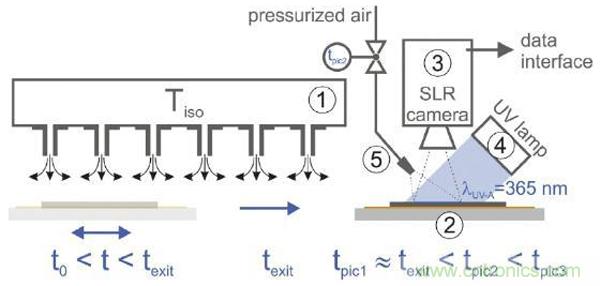 ①-對流槽噴嘴干燥機,②-溫控板,③-SLR相機,④-UV燈,⑤-加壓空氣噴嘴