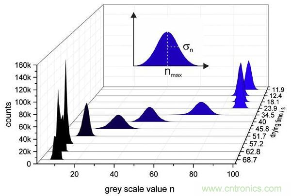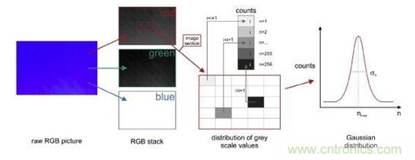 原始的RGB圖像分割成紅(red)、綠(grenn)、藍(blue)三原色,將圖像劃分為10 X 10個部分,計算分析每個部分細節(jié)。對像素點三原色分量灰度值進行計數(shù),然后做成高斯分布圖,標準偏差σ和平均灰度值nmax作為圖像處理的特征量