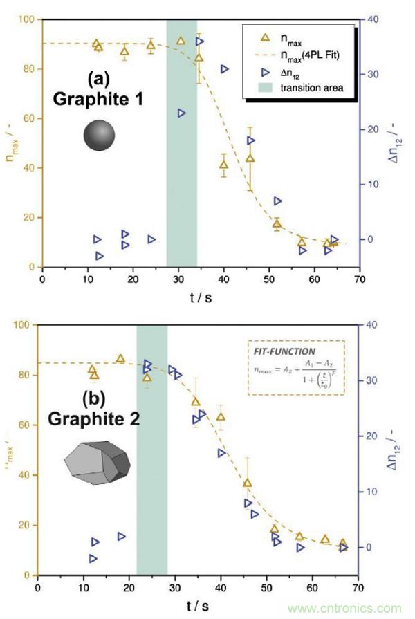 圖6.在烘干機中不同停留時間下第一張照片的nmax(三次實驗平均值),以及第一、二張照片的差值Δn12(單次實驗)的對比:(a)Graphite 1 (球形, d50 = 8.9 μm) , (b) Graphite 2 (多面體, d50 = 20.4 μm)。nmax與四參數(shù)邏輯(4PL)擬合曲線近似,并表明了不同的初始平臺。從恒定nmax平臺到中間階段的過渡時域以綠色突出顯示。