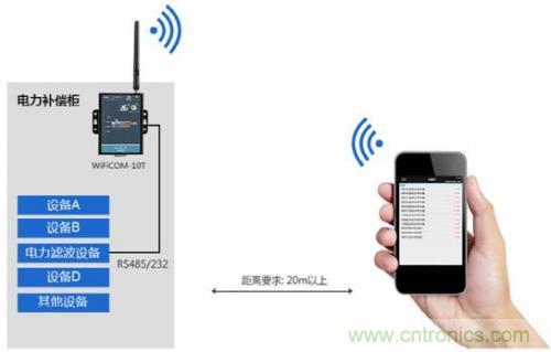 電力補償裝置的巡檢一般需要人工開柜進行數(shù)據(jù)的查看、調(diào)整等操作,工作繁瑣切具有一定危險性,本項目利用WiFiCOM-10T串口轉(zhuǎn)Wi-Fi模塊,在傳統(tǒng)裝置的基礎(chǔ)上利用原有的RS-485/232通訊接口快速進行產(chǎn)品升級,將串口數(shù)據(jù)轉(zhuǎn)化成Wi-Fi信號,巡檢人員即可通過手機或iPad進行設(shè)備巡檢,并實現(xiàn)遙控、遙測、遙信等功能。