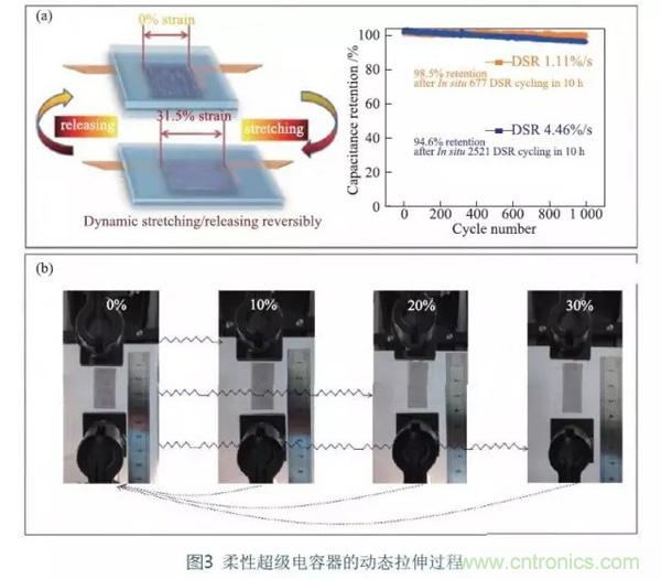 Zang等充分利用石墨烯網(wǎng)狀薄膜可與基底緊密結(jié)合的特點,獲得以預拉伸后的褶皺PDMS為基底、石墨烯網(wǎng)狀薄膜為電極材料的可動態(tài)拉伸(彎曲)超級電容器。動態(tài)拉伸(彎曲)頻率可高達60%/s。拉伸過程通過CV曲線進行實時檢測,結(jié)果表明,動態(tài)拉伸(彎曲)過程中未見明顯的性能破壞,具有很好的動態(tài)變形性能。