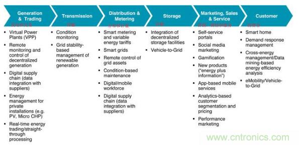 數(shù)據(jù)主導的智慧正在或多或少地進入能源價值鏈的所有步驟中,突出的重點是發(fā)電,配電,計量和消費。圖4中更詳細地說明了IoT應用程序擴展到能源價值鏈中(請注意,每個國家的能源價值鏈會稍有不同;例如,英國的智能電表是零售業(yè))。