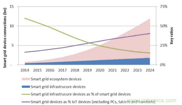 這些數(shù)字有三個明確的信息。首先,物聯(lián)網(wǎng)智能電網(wǎng)中包括的設備總量預計將迅速增長,從今天的不到10億而2024年增加將達到120億。第二,也許不奇怪的是,在依賴于智能電網(wǎng)功能的設備之前,將采用與智能電網(wǎng)基礎設施相關的設備。第三,與智能電網(wǎng)相關的設備將占據(jù)連接設備的越來越多的份額。這些預測顯示,到2024年,預計所有物聯(lián)網(wǎng)設備云連接(不包括PC,平板電腦和手機)的40%以上屬于智能電網(wǎng)生態(tài)系統(tǒng),將智能電網(wǎng)和VPP概念牢固地置于物聯(lián)網(wǎng)(IoT)的核心之中。