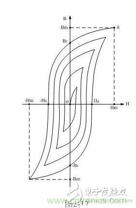 如果再使H逐漸退到零,則與此同時B也逐漸減少。然而H和B對應的曲線軌跡并不沿原曲線軌跡a-0返回,而是沿另一曲線下降到Br,這說明當H下降為零時,鐵磁物質中仍保留一定的磁性,這種現(xiàn)象稱為磁滯,Br稱為剩磁。將磁場反向,再逐漸增加其強度,直到H=-Hc,磁通密度消失,這說明要消除剩磁,必須施加反向磁場Hc。Hc稱為矯頑力。它的大小反映鐵磁材料保持剩磁狀態(tài)的能力。圖2-16表明,當磁場按Hm→0→-Hc→-Hm→0→Hc→Hm次序變化時,B所經歷的相應變化為Bm→Br→0→-Bm→-Br→0→Bm。于是得到一條閉合的B~H曲線,稱為磁滯回線。所以,當鐵磁材料處于交變磁場中時(如變壓器中的鐵芯),它將沿磁滯回線反復被磁化→去磁→反向磁化→反向去磁。在此過程中要消耗額外的能量,并以熱的形式從鐵磁材料中釋放,這種損耗稱為磁滯損耗。前面已經證明,磁滯損耗與磁滯回線所圍面積成正比。