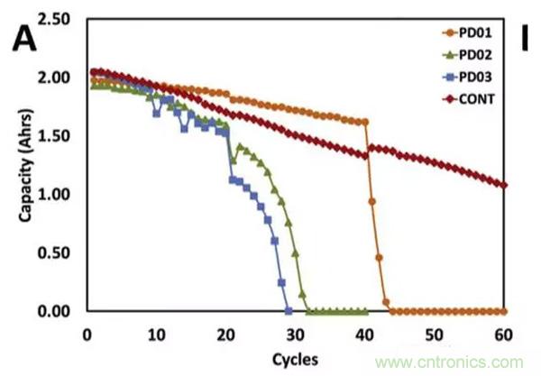 針對三個階段電池的衰降機理的研究認為,階段1可能是因為電池SEI膜生長需要消耗一部分Li+,因此衰降速度較快。在階段2隨著SEI膜結(jié)構(gòu)的穩(wěn)定,內(nèi)部較為穩(wěn)定,因此衰降速度較慢,在階段3隨著電池老化,開始發(fā)生活性物質(zhì)損失,電極活性界面減少,導致電池對于電流十分敏感。圖C是針對不同的截止電壓對電池衰降速度影響的實驗,從實驗結(jié)果可以看到,當把充電截止電壓提高到4.3V時會導致電池的循環(huán)性能急劇惡化,降低充電截止電壓可以有效的改善電池的循環(huán)性能。