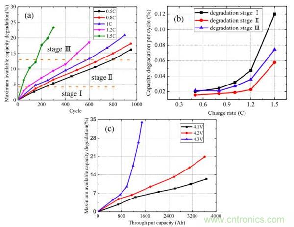 鋰離子電池的放電制度很大程度上依賴于使用者,好的放電制度對于有的使用者而言并不一定適用。但是充電制度則主要是設計者進行控制,因此對于充電制度對電池壽命衰降的影響的研究,能夠更好的指導我們對鋰離子電池的設計。北京交通大學的YangGao等針對不同的充電制度對鋰離子電池壽命衰降的影響,并研究了其作用機理,提出了鋰離子電池的壽命衰降模型。YangGao的研究顯示,當充電電流和截止電壓超過一定的數(shù)值時,鋰離子電池的衰降將被極大的加速,為了降低鋰離子電池的衰降速率,需要針對不同的體系,選擇合適的充放電電流和截止電壓。