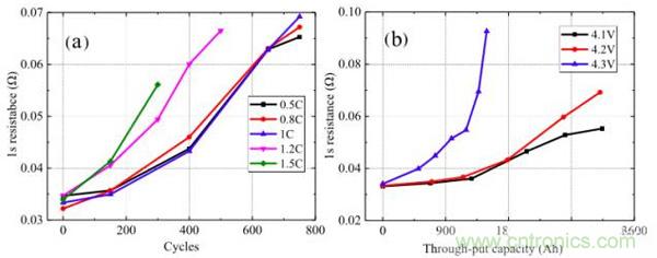 對電池的動態(tài)內(nèi)阻分析如下圖所示,從圖a測試結(jié)果來看,當充電電流小于1C時,電池動態(tài)內(nèi)阻隨著電池循環(huán)的變化趨勢幾乎時一樣的,但是當充電電流超過1C時,電池動態(tài)內(nèi)阻增加速度會隨著充電速率的增加而快速增加。從圖b的測試結(jié)果來看,當充電截止電壓為4.3V時,電池動態(tài)內(nèi)阻增加非常迅速表明高截止電壓會惡化電池的動力學條件,截止電壓為4.1V和4.2V時電池動態(tài)內(nèi)阻增加較為緩慢。