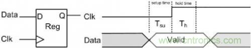 建立時間(Setup Time)常用Tsu表示,指的是在觸發(fā)器的時鐘信號上升沿到來以前,數(shù)據(jù)和使能信號穩(wěn)定不變的時間,如果建立時間不夠,數(shù)據(jù)將不能在這個時鐘上升沿被打入觸發(fā)器,使能信號無效,也就是說在這個時鐘周期對數(shù)據(jù)的操作時無效的;保持時間(Hold Time)常用Th表示,指的是在觸發(fā)器的時鐘信號上升沿到來以后,數(shù)據(jù)和使能信號穩(wěn)定不變的時間,如果保持時間不夠,數(shù)據(jù)同樣不能被打入觸發(fā)器,對數(shù)據(jù)的操作同樣是無效的,使能信號無效。數(shù)據(jù)要能穩(wěn)定傳輸,就必須滿足建立時間和保持時間的關系,圖 4標識了它們間的關系。