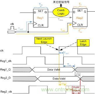 如圖 6所示,為分析建立時間/保持時間的基本電路圖。Tclk1為Reg1的時鐘延時,Tclk2為Reg2的時鐘延時,Tco為Reg1固有延時,Tdata為Reg1的到Reg2之間組合邏輯的延時,Tsu為Reg2的建立時間,Th為Reg2的保持時間,設時鐘clk周期為T,這里分析數(shù)據(jù)的建立時間和保持時間。
