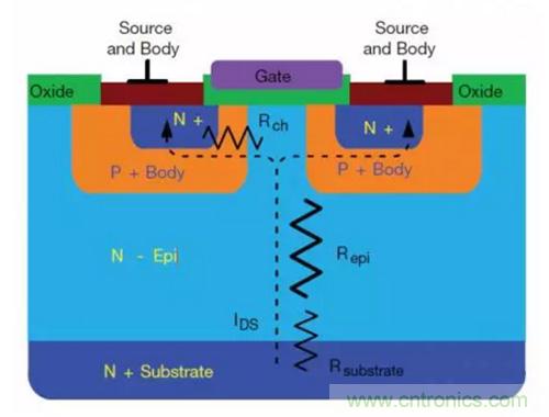 圖1顯示了一種傳統(tǒng)平面式高壓MOSFET的簡單結(jié)構(gòu)。平面式MOSFET通常具有高單位芯片面積漏源導(dǎo)通電阻,并伴隨相對更高的漏源電阻。使用高單元密度和大管芯尺寸可實現(xiàn)較低的RDS(on)值。但大單元密度和管芯尺寸還伴隨高柵極和輸出電荷,這會增加開關(guān)損耗和成本。另外還存在對于總硅片電阻能夠達(dá)到多低的限制。器件的總RDS(on)可表示為通道、epi和襯底三個分量之和:
