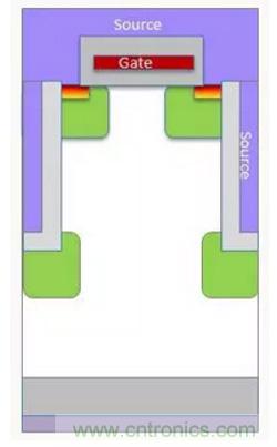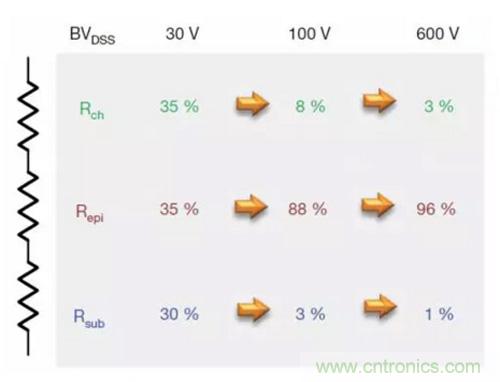 圖2顯示平面式MOSFET情況下構(gòu)成RDS(on) 的各個分量。對于低壓MOSFET,三個分量是相似的。但隨著額定電壓增加,外延層需要更厚和更輕摻雜,以阻斷高壓。額定電壓每增加一倍,維持相同的RDS(on)所需的面積就增加為原來的五倍以上。對于額定電壓為600V的MOSFET,超過95%的電阻來自外延層。顯然,要想顯著減小RDS(on)的值,就需要找到一種對漂移區(qū)進(jìn)行重?fù)诫s的方法,并大幅減小epi電阻。