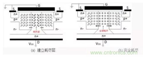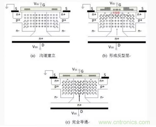 當(dāng)MOS導(dǎo)通時,柵極和源極的電場將柵極下的P區(qū)反型,在柵極下面的P區(qū)產(chǎn)生N型導(dǎo)電溝道,同時,源極區(qū)的電子通過導(dǎo)電溝道進(jìn)入垂直的N+區(qū),中和N+區(qū)的正電荷空穴,從而恢復(fù)被耗盡的N+型特性,因此導(dǎo)電溝道形成,垂直N+區(qū)摻雜濃度高,具有較低的電阻率,因此導(dǎo)通電阻低。