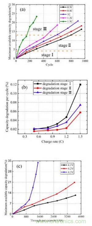 從數(shù)據(jù)可以看到,隨著充電的倍率的加大,鋰離子電池的衰降速率也在快速增加,并且從曲線的斜率來看,電池的衰降速度存在三個(gè)不同的階段,前期衰降速度較快的階段(階段1),中間衰降速度較慢的穩(wěn)定階段(階段2),和后期的衰降速率加速階段(階段3)。針對三個(gè)階段電池的衰降機(jī)理的研究認(rèn)為,階段1可能是因?yàn)殡姵豐EI膜生長需要消耗一部分Li+,因此衰降速度較快。在階段2隨著SEI膜結(jié)構(gòu)的穩(wěn)定,內(nèi)部較為穩(wěn)定,因此衰降速度較慢,在階段3隨著電池老化,開始發(fā)生活性物質(zhì)損失,電極活性界面減少,導(dǎo)致電池對于電流十分敏感。圖C是針對不同的截止電壓對電池衰降速度影響的實(shí)驗(yàn),從實(shí)驗(yàn)結(jié)果可以看到,當(dāng)把充電截止電壓提高到4.3V時(shí)會導(dǎo)致電池的循環(huán)性能急劇惡化,降低充電截止電壓可以有效的改善電池的循環(huán)性能。