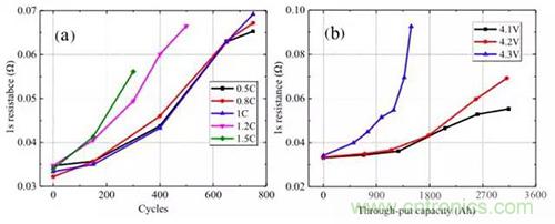 對電池的動(dòng)態(tài)內(nèi)阻分析如下圖所示,從圖a測試結(jié)果來看,當(dāng)充電電流小于1C時(shí),電池動(dòng)態(tài)內(nèi)阻隨著電池循環(huán)的變化趨勢幾乎時(shí)一樣的,但是當(dāng)充電電流超過1C時(shí),電池動(dòng)態(tài)內(nèi)阻增加速度會隨著充電速率的增加而快速增加。從圖b的測試結(jié)果來看,當(dāng)充電截止電壓為4.3V時(shí),電池動(dòng)態(tài)內(nèi)阻增加非常迅速表明高截止電壓會惡化電池的動(dòng)力學(xué)條件,截止電壓為4.1V和4.2V時(shí)電池動(dòng)態(tài)內(nèi)阻增加較為緩慢。