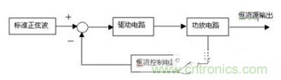 電路組成框圖如圖2所示:這是一個閉環(huán)控制系統(tǒng),電流負反饋電路。標準正弦波產(chǎn)生一個頻率穩(wěn)定、對稱、失真度低的1KHz正弦波信號。驅(qū)動電路把正弦波放大,去推動功放電路,得到正弦交流電流輸出。恒流控制電路從功放輸出中得到的信號,通過與給定的信號相比較,來調(diào)節(jié)驅(qū)動電路的信號,從而使輸出電流保持穩(wěn)定。