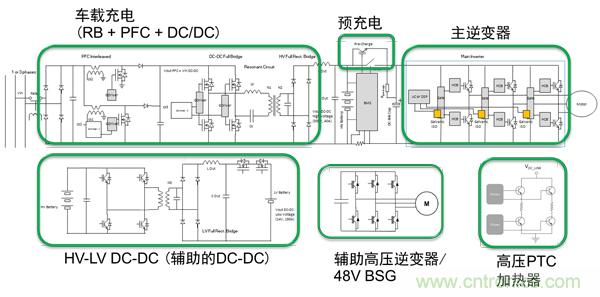 HEV/EV的重點應(yīng)用有:車載充電器、電池管理、牽引逆變器、輔助逆變器、48 V皮帶啟動發(fā)電機(BSG)和DC-DC轉(zhuǎn)換器。