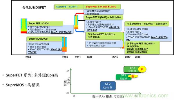 SJ MOSFET是利用電荷平衡技術(shù)實現(xiàn)出色的低導(dǎo)通電阻和低柵極電荷性能、從而最小化導(dǎo)通損耗并提供出色的開關(guān)性能的新型MOSFET。圖3所示為650 V SJ MOSFET技術(shù)演進。