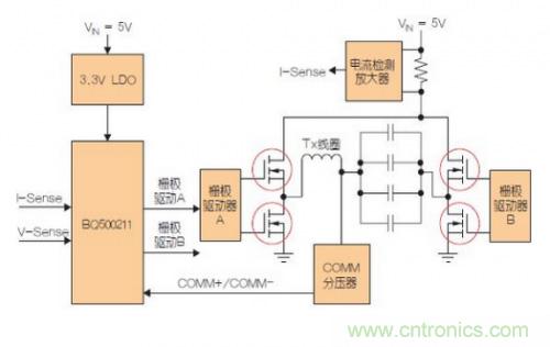 Qi發(fā)射器控制器擁有輸入功率限制選項,至發(fā)射器的輸入電流可被限制在500mA,從而允許通過USB端口或小型電源適配器供電運(yùn)行。bq500211發(fā)射器的穩(wěn)壓電路有3.3V的LDO穩(wěn)壓器構(gòu)成輸出芯片供電,LDO的最大優(yōu)勢就是PNP管只會帶來很小的導(dǎo)通壓降,滿載的跌落電壓的典型值小于500mV,輕載時的壓降僅有10~20mV。LDO的壓差為:Vdrop = Vsat (LDO 穩(wěn)壓器)。
