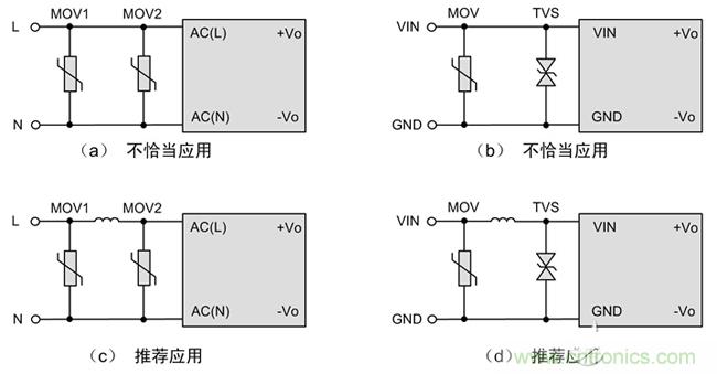 電源模塊體積小,在EMC要求比較高的場合,需要增加額外的浪涌防護(hù)電路,以提升系統(tǒng)EMC性能。如圖1所示,為提高輸入級(jí)的浪涌防護(hù)能力,在外圍增加了壓敏電阻和TVS管。但圖中的電路(a)、(b)原目的是想實(shí)現(xiàn)兩級(jí)防護(hù),但可能適得其反。如果(a)中MOV2的壓敏電壓和通流能力比MOV1低,在強(qiáng)干擾場合,MOV2可能無法承受浪涌沖擊而提前損壞,導(dǎo)致整個(gè)系統(tǒng)癱瘓。同樣的,電路(b),由于TVS響應(yīng)速度比MOV快,往往是MOV未起作用,而TVS過早損壞。