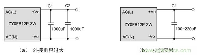如圖2中的電路(a)所示,一個(gè)3W的模塊,輸出使用了2000uF的電容,而通過查閱產(chǎn)品手冊了解到,模塊建議最大輸出電容為800uF。輸出電容過大可能導(dǎo)致啟動(dòng)不良,而對(duì)于不帶短路保護(hù)的微功率DC-DC模塊,輸出電容過大甚至可能導(dǎo)致模塊永久損壞。