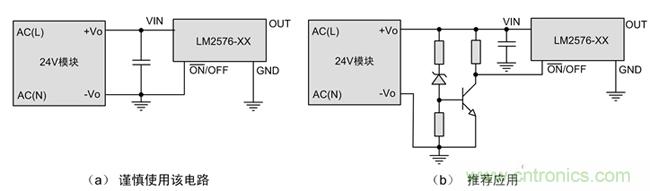 因此推薦使用電路(b),外置簡單的欠壓鎖定,使24V模塊輸出電壓建立到預(yù)置值后再啟動(dòng)LM2576等外接開關(guān)電源芯片,可以很大程度上避免啟動(dòng)不良問題。