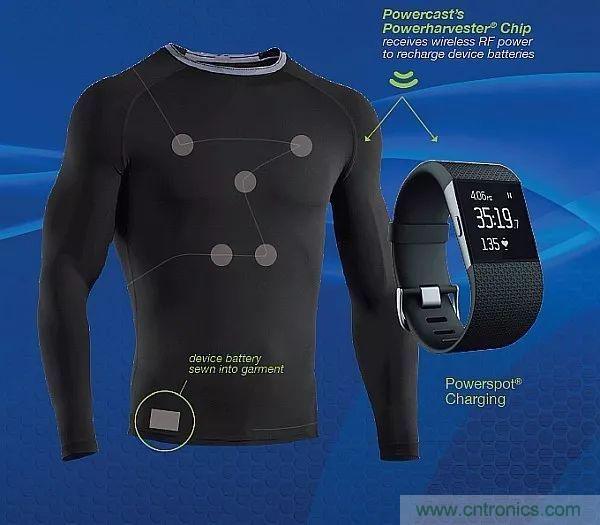 可穿戴設(shè)備設(shè)計人員可以將Powercast公司的Powerharvester IC嵌入到可穿戴設(shè)備中,為一個或多個設(shè)備提供一定距離的無線充電。通過收集ISM頻段的射頻能量,這種IC可以向可穿戴設(shè)備的電池提供涓流充電。這種方法支持可水洗的密封設(shè)備。