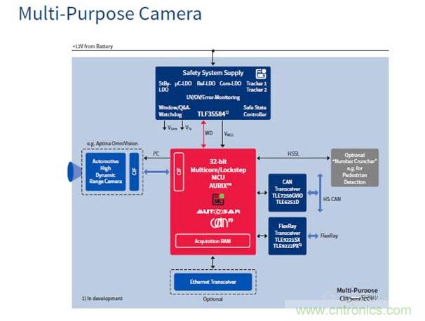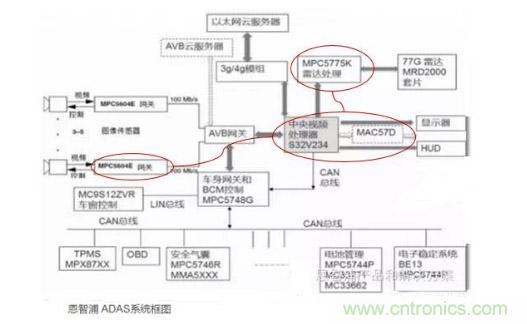 NXP已經(jīng)發(fā)布Blubox平臺(tái),為OEM廠商提供設(shè)計(jì)、制造、銷售Level 4級(jí)(SAE)無(wú)人駕駛汽車的解決方案計(jì)算平臺(tái)。下圖是NXP的ADAS系統(tǒng)框圖,該系統(tǒng)對(duì)多路視頻、77G雷達(dá)的數(shù)據(jù)進(jìn)行融合處理,然后傳送給云端和車身系統(tǒng)。我們看到NXP是能夠提供全套R(shí)eference方案的公司,在這一塊的產(chǎn)品線很全,雖然現(xiàn)在沒有做更多的芯片集成,而是提供相對(duì)分散的芯片及解決方案。我們這里重點(diǎn)介紹一下中央處理器S32V234和MPC5775K,MPC5775K是對(duì)雷達(dá)數(shù)據(jù)進(jìn)行處理,而S32V234是對(duì)多傳感器處理過(guò)的數(shù)據(jù)進(jìn)行融合分析,通過(guò)CAN總線,把結(jié)果傳給車身系統(tǒng)。