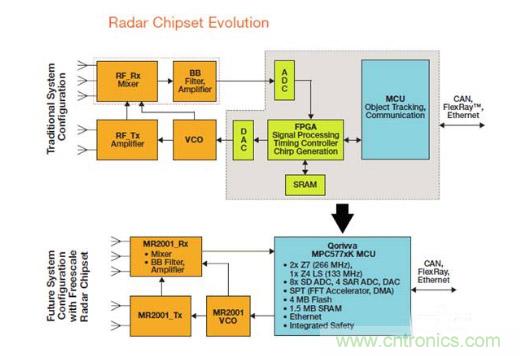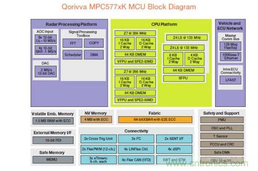 QorivvaMPC567xK系列基于Power Architecture® 的32位MCU,MPC577XK是專門的雷達(dá)信息處理芯片,該系列增加了芯片的存儲(chǔ)器,提升了運(yùn)行速度和性能,能夠支持自適應(yīng)巡航控制、智能大燈控制、車道偏離警告和盲點(diǎn)探測(cè)等應(yīng)用。從整個(gè)雷達(dá)系統(tǒng)來(lái)看,結(jié)合77G雷達(dá)收發(fā)器芯片組、Qorivva MPC567xK MCU、FPGA, ADC, DAC, SRAM, 支持長(zhǎng)、中、短距離應(yīng)用。這里需要重點(diǎn)關(guān)注的是信號(hào)處理工具集(Signal Processing Toolbox)設(shè)計(jì),包括了FFT、DMA、COPY、Scheduler。目前77GHz的FCMW型雷達(dá)在數(shù)字信號(hào)處理中需要使用FFT,即快速傅里葉變換,一般車載雷達(dá)的采樣點(diǎn)在512-2048左右,從芯片架構(gòu)圖我們看到專門的FFT電路。