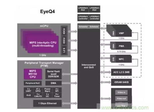 其中特別要指出的是Mobileye的EyeQ系列,已經(jīng)被多家汽車制造商使用,包括奧迪、寶馬、菲亞特、福特、通用、本田、日產(chǎn)、標(biāo)致、雪鐵龍、雷諾、沃爾沃和特斯拉等在內(nèi)。最近的EyeQ4展示的性能已經(jīng)達(dá)到2.5 萬(wàn)億次每秒的性能,其運(yùn)行功率可低至3W。從硬件架構(gòu)來(lái)看,該芯片包括了一組工作在1GHZ的工業(yè)級(jí)四核MIPS處理器,以支持創(chuàng)新性的多線程技術(shù)能更好的進(jìn)行數(shù)據(jù)的控制和管理。多個(gè)專用的向量微碼處理器(VMP),用來(lái)應(yīng)對(duì)ADAS相關(guān)的圖像處理任務(wù)(如:縮放和預(yù)處理、翹曲、跟蹤、車道標(biāo)記檢測(cè)、道路幾何檢測(cè)、濾波和直方圖等)。一顆軍工級(jí)MIPS Warrior CPU位于次級(jí)傳輸管理中心,用于處理片內(nèi)片外的通用數(shù)據(jù)。