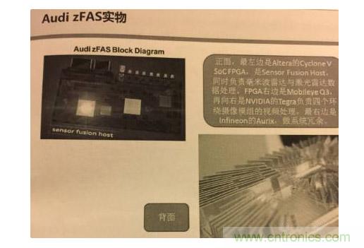 由于目前融合多是雷達(dá)與攝像頭融合,所需要的帶寬,一般的ASIC都能夠滿足。但是要融合激光雷達(dá),則最好用FPGA,F(xiàn)PGA做傳感器Hub是最合適不過(guò)的。同時(shí)傳感器融合目前應(yīng)用較少,合適的ASIC并不好找,F(xiàn)PGA成為主流選擇。同時(shí),對(duì)一些精度要求較高的雷達(dá),如使用單精度浮點(diǎn)處理實(shí)現(xiàn)一個(gè)4096點(diǎn)FFT,采樣點(diǎn)越多,誤差就越小,但運(yùn)算量會(huì)大幅度增加。它在每個(gè)時(shí)鐘周期輸入輸出四個(gè)復(fù)數(shù)采樣。每個(gè)FFT內(nèi)核運(yùn)行速度超過(guò)80 GFLOP,這一般需要FPGA才能比較好的實(shí)現(xiàn)。一般車載雷達(dá)的采樣點(diǎn)在512-2048左右,但軍用的可以達(dá)到8192,必須配備FPGA。如下圖在AudizFAS的實(shí)物中,采用了Altera的CycloneV SoCFPGA,作為sensor fusion,同時(shí)負(fù)責(zé)毫米波雷達(dá)與激光雷達(dá)數(shù)據(jù)處理。