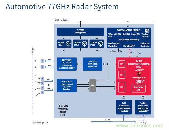 作為汽車電子、功率半導(dǎo)體以及智能卡芯片的全球市場(chǎng)領(lǐng)袖,英飛凌一直以來(lái)為汽車等工業(yè)應(yīng)用提供半導(dǎo)體和系統(tǒng)解決方案。英飛凌在24/77/79G雷達(dá)、激光雷達(dá)等傳感器器件及處理芯片方面都具有領(lǐng)先的技術(shù)。除此之外,在車身控制、安全氣囊、EPS、TPMS等等各方面都有自己的解決方案。