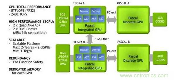 NVIDIA推出的Drive PX2被黃仁勛稱為“為汽車設(shè)計(jì)的超級(jí)電腦”,它將成為汽車的標(biāo)準(zhǔn)配備,可以用來(lái)感知汽車所處位置、辨識(shí)汽車周遭的物體,并且即時(shí)計(jì)算最安全的路徑。“Tegra X1處理器和10GB內(nèi)存,能夠同時(shí)處理12個(gè)200萬(wàn)像素?cái)z像頭每秒60幀的拍攝圖像,并通過(guò)環(huán)境視覺計(jì)算技術(shù)和強(qiáng)大的深層神經(jīng)網(wǎng)絡(luò),主動(dòng)識(shí)別道路上的各種車輛,甚至還能檢測(cè)前方車輛是否在開門。Driver PX2還搭載了其他合作伙伴的芯片,包括Avago的PEX8724(24-lane,6-port,第三代 PCIe Gen交換機(jī))用于兩塊Parker之間的互聯(lián)。還有一片英特爾收購(gòu)的Altera提供的FPGA,用于執(zhí)行實(shí)時(shí)操作系統(tǒng)。FPGA的型號(hào)為Cyclone V 5SCXC6,是Altera的頂級(jí)產(chǎn)品,邏輯運(yùn)算為110K,注冊(cè)器達(dá)166036。最后還有一款英飛凌的AURIX TC 297 MCU做安全控制,據(jù)說(shuō)可以讓PX2達(dá)到ASIL C級(jí)水平。 還有博通的BCM89811低功耗物理層收發(fā)器(PHY),使用BroadR-Reach車載以太網(wǎng)技術(shù),在單對(duì)非屏蔽雙絞線上的傳輸速率可達(dá)100Mbps。所以NVidia實(shí)際上推出了板級(jí)的ADAS系統(tǒng)。
