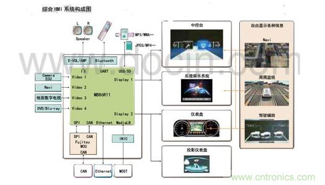 富士通的ADAS技術(shù)主要涉及透過(guò)攝像頭和傳感器的結(jié)合,實(shí)現(xiàn)圖像識(shí)別輔助和接近目標(biāo)檢測(cè),應(yīng)用的領(lǐng)域主要有360度3D立體全景輔助、可視停車輔助、駕駛盲區(qū)監(jiān)控、安全開車門以及車行駛方向周圍的障礙物和行人的識(shí)別。包括基于MB86R11“Emerald-L”2D/3D圖像SoC的全景視頻系統(tǒng)支持前后左右四個(gè)攝像頭進(jìn)行汽車周邊環(huán)境的實(shí)時(shí)全景視頻監(jiān)測(cè)。從公開資料顯示,富士通似乎更熱衷于虛擬儀表盤及車載信息娛樂(lè)系統(tǒng)的構(gòu)建,但這一塊是最容易被國(guó)內(nèi)芯片公司模仿并超越的。