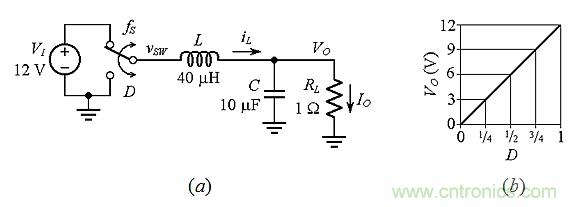 圖1:(a)降壓轉(zhuǎn)換原理(fS和D表示開關(guān)切換的頻率和占空比);(b)VO是D的函數(shù)。