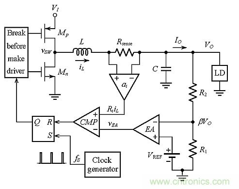 控制器如何調(diào)整D?控制器有兩類:電壓模式和電流模式控制器。下面將討論電流模式控制器下面的一個(gè)常見類型——峰值電流模式控制(PCMC),圖3是它的一個(gè)示例。為感測(cè)電感電流iL,電路使用一個(gè)小串聯(lián)電阻Rsense,其壓降由具有ai增益的放大器放大。該放大器將iL轉(zhuǎn)換成電壓RiiL,其中: