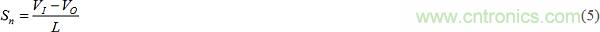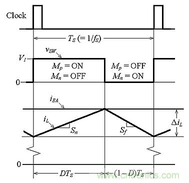 當(dāng)一個(gè)時(shí)鐘脈沖置位觸發(fā)器時(shí),開始一個(gè)周期。這將關(guān)閉Mp開關(guān),使vSW=VI。在該周期的這一部分(在圖4中表示為DTS),電感器電流iL以斜率Sn上升,由iL-vL電感法則掌控,或Sn=diL/dt=vL/L。在這段時(shí)間,我們得到vL=VI– VO,所以: