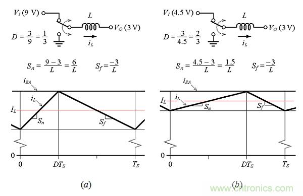 圖3所示電路存在兩個(gè)缺陷。第一個(gè)缺陷如圖5所示,是將VO調(diào)節(jié)為3.0V的轉(zhuǎn)換器設(shè)計(jì)(為簡單起見,假設(shè)周期在t = 0時(shí)開始)。圖4a示出了在VI=9V條件下,穩(wěn)態(tài)電感器電流iL和其平均值IL,對(duì)應(yīng)于D = 3/9 = 1/3的占空比。假設(shè)現(xiàn)在VI下降到4.5V,則對(duì)應(yīng)D = 3 / 4.5 = 2/3的占空比。假設(shè)vEA沒時(shí)間發(fā)生顯著變化,那么平均電感器電流iL將增加,如圖5b所示。這是因?yàn)楫?dāng)下坡Sf在-3/L保持恒定時(shí),上坡Sn從(9-3)/L減小到(4.5-3)/L,即從6/L減少到1.5/L。