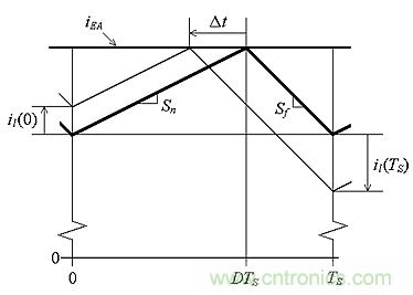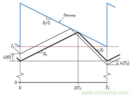 第二個(gè)缺陷是稱為次諧波振蕩的不穩(wěn)定形式,當(dāng)D>0.5時(shí)會(huì)產(chǎn)生這種不穩(wěn)定。圖6顯示了周期開始時(shí)電感電流擾動(dòng)il(0)如何在周期結(jié)束時(shí)演化為擾動(dòng)il(TS)。例如,擾動(dòng)可能由前一周期中比較器失能引起。借助簡單的幾何,我們可以得出il(0)/△t = Sn和il(TS)/△t = Sf。消除△t,得出: