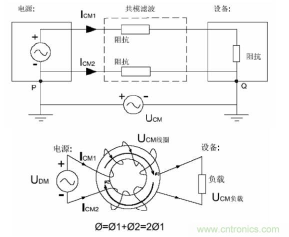 如果有用信號是差模信號而干擾信號是共模信號,可使用共模電感來抑制干擾信號: