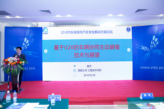 西南大學(xué)汽車電子專家冀杰博士在論壇上做了車規(guī)與基于V2X的車輛協(xié)同主動(dòng)避撞技術(shù)展望的大會(huì)報(bào)告。