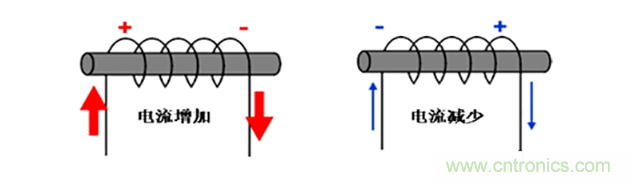 當(dāng)交流電通過電感時(shí),電流產(chǎn)生的磁場將其他的繞線切隔,因而產(chǎn)生反向電壓,從而阻礙電流變化。反之當(dāng)電流減少時(shí),則向電流增加的方向產(chǎn)生。