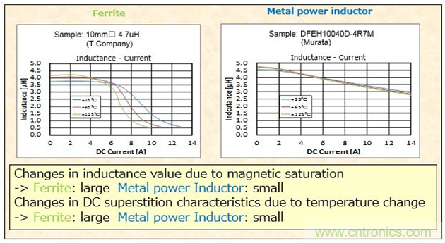 同時(shí),針對溫度的變化,金屬合金粉材質(zhì)的電感衰減比鐵氧體要緩慢很多。
