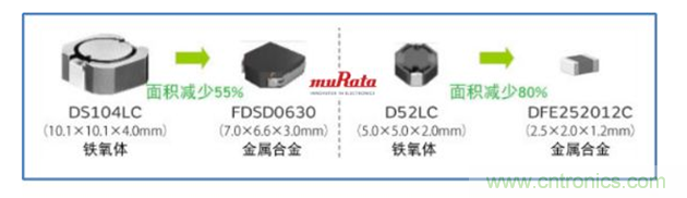同等特性時(shí)(感值、飽和電流等),金屬合金功率電感比鐵氧體功率電感的外形尺寸小50%左右,可以實(shí)現(xiàn)小型化和薄型化。