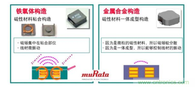 對于金屬合金構(gòu)造的電感來說,因?yàn)樾纬删€圈的磁性材料是微粒的,所以磁場較分散;一體成型構(gòu)造也能夠控制線材的振動,從而很難產(chǎn)生嘯叫問題。