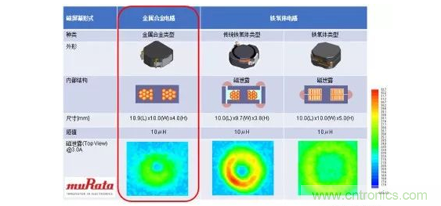 以村田公司生產(chǎn)的功率電感器為例,從產(chǎn)品工藝上可分為繞線電感和疊層電感,從材料上可分為金屬合金粉(一體成型)電感和鐵氧體電感。與鐵氧體電感相比,金屬合金電感有以下特點(diǎn):