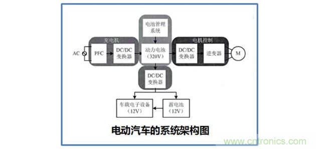 另一方面,DC/DC變換器可以將電動機(jī)制動剎車時(shí)由機(jī)械能轉(zhuǎn)化而來的電能回饋給蓄電池組,其效率高達(dá)85%~95%,遠(yuǎn)大于發(fā)電機(jī)的正常效率。以可控的方式給蓄電池組充電,尤其是在電動汽車需要頻繁啟動和制動的城市工況運(yùn)行條件下,可以有效地回收制動能量,增加電動汽車的行駛里程。因此,電動汽車采用DC/DC變換器可以優(yōu)化電動機(jī)控制、提高電動汽車的整體效率和性能。下圖為電動汽車的系統(tǒng)架構(gòu)圖。