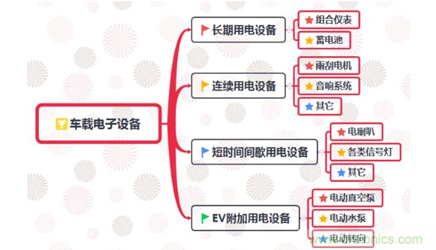作為電動汽車的供電設(shè)備,DC/DC變換器也給車載電子設(shè)備供電。根據(jù)純電動汽車車載電子設(shè)備不同屬性,可把用電設(shè)備分為長期用電設(shè)備、連續(xù)用電設(shè)備、短時(shí)間間歇用電設(shè)備和EV附加用電設(shè)備等四種類型,如下圖所示。同時(shí),DC/DC變換器的體積和種類都很小且輸出穩(wěn)定。