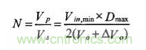變壓器的變比與變換器的傳輸功率、主電路拓?fù)浣Y(jié)構(gòu)以及占空比相關(guān)。越大,變壓器原邊的電流越小,原邊總的損耗越小,同時(shí)副邊整流管要承受的電壓應(yīng)力也越小,變壓器的效率越高。同時(shí),應(yīng)能滿足在所有輸入電壓范圍內(nèi)都能得所需要的輸出電壓,因此,在計(jì)算變壓器變比的時(shí)候應(yīng)考慮在最小輸入電壓情況下輸出滿載且占空比最大進(jìn)行。